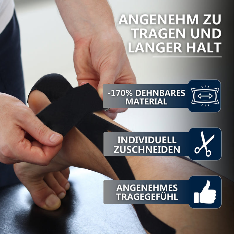 Kinesiotape ist ein elastisches Baumwolltape mit 3% Elastan. Es passt sich durch die Dehnbarkeit ideal an den menschlichen Bewegungsapparat an. Es kann den Körper bei verschiedenen Prozessen und Beschwerden unterstützen ohne die Beweglichkeit einzuschränken.